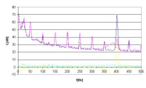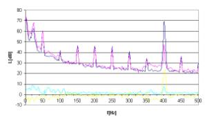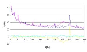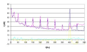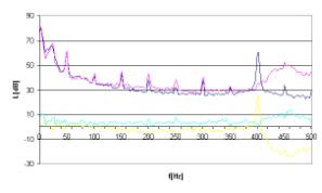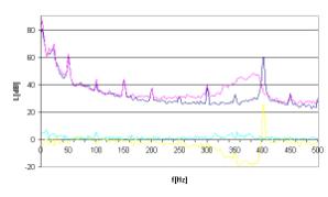 Rys 57. Charakterystyki częstotliwościowe dla sygnału hałasu w postaci tonu o częstotliwości 400Hz.