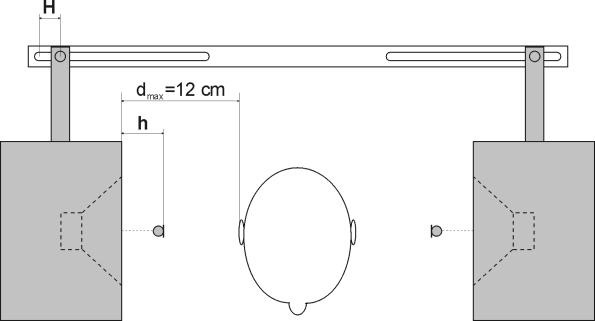 Na Rys 58 przedstawiono sposób umieszczenia głośników aktywnego zagłówka w trakcie drugiej i trzeciej sesji pomiarowej. Symbolem H oznaczono odległość głośników zagłówka od ich skrajnego zewnętrznego położenia na stelażu mocującym, przy czym dla H = 0 głośniki aktywnego zagłówka znajdują się w odległości dmax = 12cm od uszu manekina. Symbolem h oznaczono odległość mikrofonu błędu od powierzchni głośnika. Zaznaczono charakterystyczne odległości (H i h) które były zmieniane w trakcie pomiarów. Odległości te zmieniano równocześnie dla obu głośników zagłówka, tak że środek symetrii zagłówka pokrywał się ze środkiem symetrii głowy.