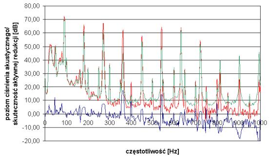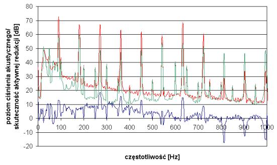 Przedstawione charakterystyki pokazują, że skuteczność redukcji poszczególnych składowych harmonicznych sygnału hałasu dochodzi do 25dB i zależy od konfiguracji źródeł wtórnych jak również od położenia detektorów sygnałów błędu. W najgorszych przypadkach nie jest możliwe uzyskanie stabilnej pracy układu (dla składowej o częstotliwości 300Hz przy prostopadłym ustawienia głośników) bądź następuje podwyższenie poziomu ciśnienia akustycznego w danym zakresie częstotliwości (dla składowej o częstotliwości 350Hz na
