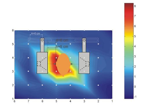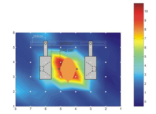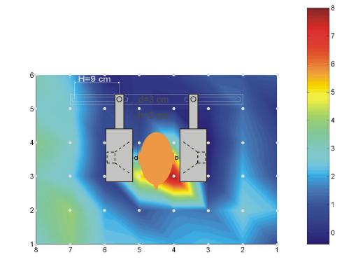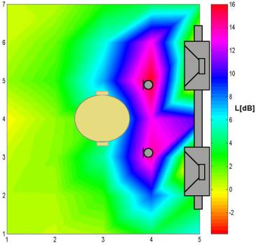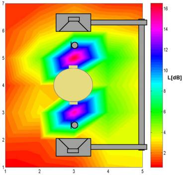 Rys 72. Mapa rozkładu skuteczności aktywnej redukcji w układzie zagłówka dla sygnału hałasu w postaci sumy ośmiu tonów harmonicznych z zakresu od 100Hz do 800Hz, dla ustawień H = 9cm i h = 2cm.