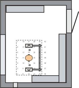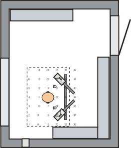 Ostatnia, trzecia seria pomiarowa, której wyniki w postaci map skuteczności aktywnej redukcji przedstawione zostały na Rys 72 , Rys 73 i Rys 74 dotyczyła pomiarów przeprowadzonych nie w kabinie dźwiękoizolacyjnej lecz w innym pomieszczeniu laboratoryjnym. Ich celem było zbadanie wpływu warunków akustycznych (rozkład poziomu ciśnienia akustycznego) panujących w miejscu umieszczenia zagłówka na skuteczność aktywnej redukcji. Podobnie jak w drugiej serii badań, pomiary zostały przeprowadzone dla sygnału hałasu w postaci sumy ośmiu tonów harmonicznych z zakresu od 100Hz do 800Hz Sposób rozmieszczenia elementów aktywnego zagłówka w stosunku do głowy manekina i obszaru pomiarowego został uwidoczniony na przedstawionych mapach. Rozkłady skuteczności zmierzono dla dwóch ustawień źródeł wtórnych i mikrofonów sygnału błędu.