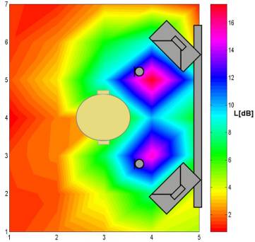 Rys 71. Mapa rozkładu skuteczności aktywnej redukcji w układzie zagłówka dla sygnału hałasu w postaci sumy ośmiu tonów harmonicznych z zakresu od 100Hz do 800Hz i dla ustawień H = 9cm i h = 2cm.