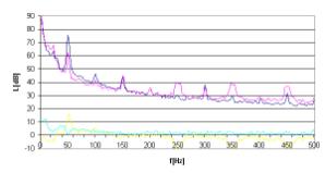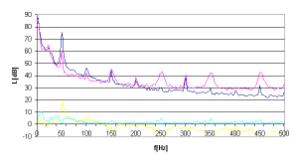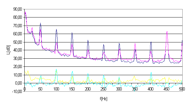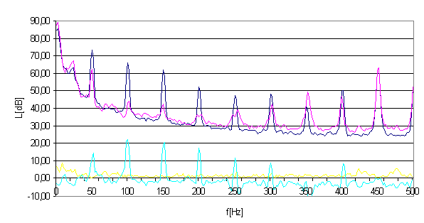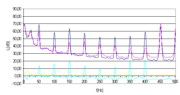 · kolor granatowy – sygnał akustyczny mierzony przed włączeniem układu aktywnej redukcji,