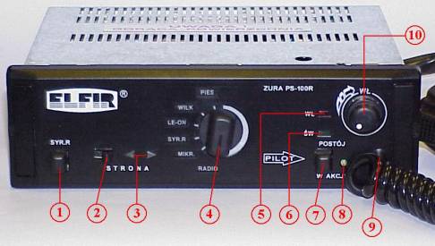 Na Rys.2.2 przedstawiono widok panelu czołowego urządzenia ZURA. Kolejnymi numerami oznaczono: 1. Przycisk syreny ręcznej, 2. Przełącznik strony, 3. Kontrolki sygnalizujące stronę, z której włączone jest światło postojowe, 4. Przełącznik rodzaju pracy,5. Kontrolka sygnalizująca włączenie ZURY, 6. Kontrolka sygnalizująca włączenie świateł ostrzegawczych, 7. Przełącznik „POSTÓJ W AKCJI” lub „PILOT”, 8. Kontrolka sygnalizująca załączenie światła „POSTÓJ W AKCJI” lub „PILOT”, 9. Mikrofon, 10. Wyłącznik/potencjometr siły głosu. Wybór generowanego przez sygnalizator sygnału umożliwia przełącznik rodzaju pracy (2). W położeniu RADIO przez głośniki podawane są komunikaty przychodzące z radiotelefonu. Do włączania urządzenia i regulacji siły głosy służy potencjometr siły głosu (7). W pozycji MIKR. przez głośnik podawane są komunikaty z mikrofonu. Podobnie jak w poprzednim trybie pracy do włączania urządzenia i regulacji siły głosu służy potencjometr siły głosu. Gdy przełącznik rodzaju pracy (2) znajduje się w położeniu SYR.R możliwe jest włączenie przy pomocy oddzielnego przycisku (1) syreny ręcznej. W chwili naciśnięcia przycisku syreny ręcznej (1) urządzenie zaczyna generować sygnał ciągły, którego częstotliwość początkowo (przez ok. 2s) narasta do ustalonej wartości i trwa do momentu zwolnienia przycisku. Po zwolnieniu przycisku częstotliwość i siła sygnału stopniowo opada (przez ok. 4s) aż do całkowitego wyłączenia syreny. W kolejnych trzech pozycjach urządzenie jest stale włączone i emituje sygnały o określonych właściwościach: ·LE-ON – sygnał z powtarzających się na przemian tonów – niskiego i wysokiego. ·WILK – sygnał przypominający wycie wilka, ·PIES – sygnał przypominający ujadanie psa. Urządzenie skonstruowane jest w taki sposób, że mikrofon posiada nadrzędność pracy nad sygnałami SYR.R, LE-ON, WILK i PIES. W momencie wciśnięcia przycisku w mikrofonie, wyłączane są generowane sygnały i możliwe jest przekazywanie komunikatów tak, jakby przełącznik rodzaju pracy znajdował się w położeniu MIKR.Obok generowania sygnałów akustycznych ZURA umożliwia także sterowanie światłami ostrzegawczymi. W pozycjach RADIO i MIKR. przełącznik (7) włącza wydzielone światło ostrzegawcze pracujące tylko w czasie akcji podczas postoju. Światło to można przełączyć za pomocą przełącznika (2) na prawą lub lewą stronę pojazdu. W pozycjach SYR. R, LE-ON, WILK i PIES włączone są światła ostrzegawcze a przełącznik (7) umożliwia załączenie dodatkowego światła (np. pilota kolumny).Rysunki od Rys. 2.3 do Rys. 2.5 pokazano wygląd i szczegóły budowy głośnika dwuwzbudnikowego.
