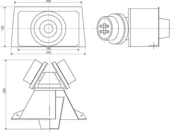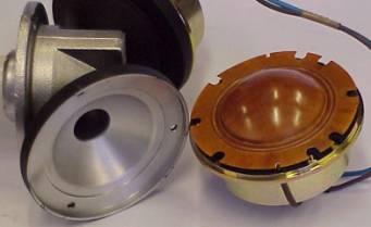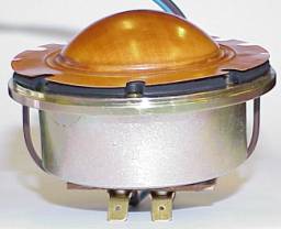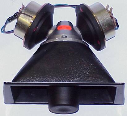 Głośnik ten jest głośnikiem tubowym (co pozwala zwiększyć wypromieniowywaną moc akustyczną) posiadającym dwa przetworniki elektroakustyczne. Jak widać na Rys.2.5 przetworniki mają postać kopułek o średnicy 60mm wykonanych z bakelitu. Częstotliwość pracy tak wykonanego głośnika mieści się przedziale 350 – 1500Hz. Głośnik ma moc nominalną 100W a jego oporność elektryczna wynosi 6.