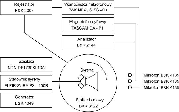 Sygnalizator ostrzegawczy przystosowano do pobierania sygnału z zewnętrznego źródła dźwięku i podłączono do generatora. Ze względu na znaczny pobór prądu i zapewnienie odpowiedniego napięcia zasilania zastosowano zasilacz o maksymalnym poborze prądu 10 A. Syrenę badanego sygnalizatora umieszczono na obrotowym stoliku, na wysokości 1,5 m od siatki. Do pomiaru wykorzystano trzy mikrofony. Sygnał z pierwszego mikrofonu wzmocniono przez wzmacniacz mikrofonowy i zapisano na rejestratorze poziomu ciśnienia akustycznego. Sygnał zsynchronizowano z kątem i prędkością obrotu stolika obrotowego, i zapisano w postaci kołowego wykresu. Sygnał pobrany z następnego mikrofonu zapisano na analizatorze i podano wewnętrznej obróbce. Dodatkowo sygnał z syreny sygnalizatora ostrzegawczego zarejestrowano na magnetofonie cyfrowym.