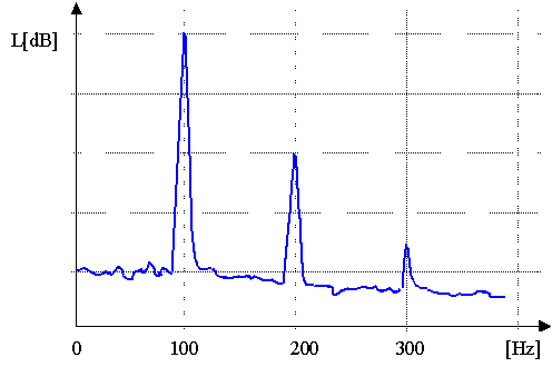 - hałas wytwarzany przez transformator ma bardzo wyraźne (dominujące) składowe częstotliwościowe (Rys. 1.),