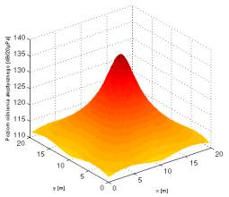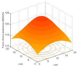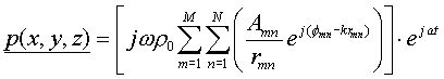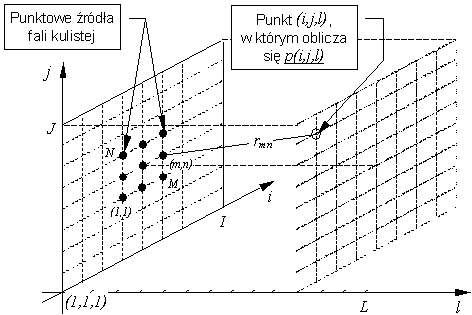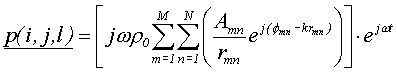 W obliczeniach rozpatrywana jest ograniczona zdyskretyzowana przestrzeń o wymiarach (I,J,L). Siatka podziału przestrzeni jest sześcienna o boku d. Ciśnienia akustyczne w postaci zespolonej w punkcie (i,j,l) pochodzącego od macierzy źródeł o wymiarach (M,N) wyraża się wzorem: