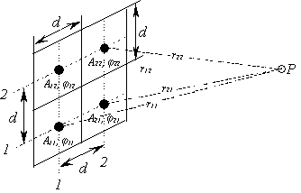 Ścianę drgającą kadzi transformatora można traktować jako złożoną z małych elementów powierzchni, emitujących falę akustyczną. Elementy te muszą być na tyle małe, aby prawdziwe było założenie, że wszystkie punkty takiego elementy drgają z jednakową amplitudą i fazą. Niech ścianę drgającą reprezentuje złożony układ akustyczny składający się z macierzy głośników. Zakładamy, że każdy głośnik w macierzy może być traktowany jako źródło fali kulistej. Założenie takie jest prawdziwe, jeżeli rozpatrujemy pole dalekie (strefę Frauhofera), w którym odległość punktów od źródła spełnia następujący warunek (rys. 3):