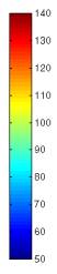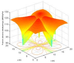 W kolumnie A zamieszczono wyniki dla układ czterech źródeł umieszczonych na wierzchołkach kwadratu o boku 0,75 m, dwa źródła w przeciwległych rogach mają fazy przesunięte o p względem dwóch pozostałych. Prędkość objętościowa wszystkich źródeł była równa 0,05 m3/s. W kolumnie B zamieszczono wyniki dla analogicznego układu źródeł z tym, że wszystkie źródła mają zgodną fazę. W kolumnie C zamieszczono skalę barw w dB/20µPa dla zamieszczonych wykresów.