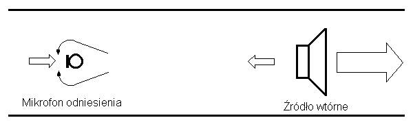 2. jeżeli fala pierwotna propaguje w ściśle określonym kierunku, a tak jest np. w falowodach akustycznych (systemy wentylacyjne itp.) zastosować przetwornik sygnału odniesienia w postaci mikrofonu o takiej charakterystyce kierunkowej, aby zminimalizować stosunek sygnału pochodzącego od źródła wtórnego do sygnału pochodzącego od źródła pierwotnego (Rys. 3).