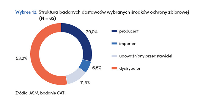 W badaniu ilościowym przeprowadzonym wśród wybranych dostawców ŚOZ, 53,2% podmiotów należało do grupy dystrybutorów, a 29,0% producentów. Respondenci mogli przyporządkować się wyłącznie do jednej z grup najlepiej charakteryzujących główną działalność podmiotu. N=4 producentów zadeklarowało, że posiada swój dział badawczy.