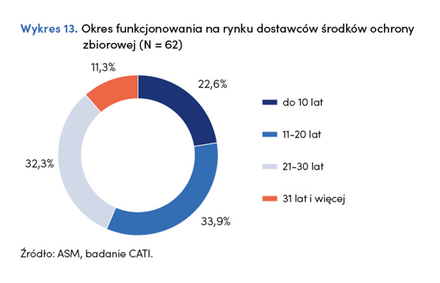 W zdecydowanej większości (98,4%) w badaniu wzięły udział firmy funkcjonujące na rynku ŚOZ co najmniej 5 lat, a żadna z firm nie działała krócej niż 1 rok. 77,4% badanych dostawców ŚOZ działa na rynku więcej niż 10 lat. Blisko co trzeci respondent funkcjonuje 21-30 lat.