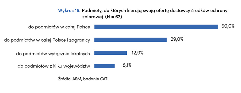 50,0% badanych dostawców kieruje swoją ofertę do podmiotów w całej Polsce, a 29,0% zarówno do przedsiębiorstw w Polsce, jak i zagranicą. Jedynie 12,9% dostawców ŚOZ działa lokalnie.
