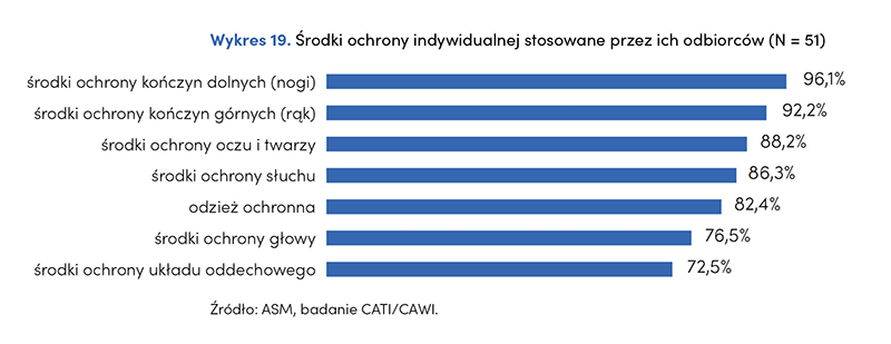 Badani odbiorcy stosują szereg ŚOI. Najczęściej respondenci zaopatrują się w środki ochrony kończyn dolnych (96,1%) i górnych (92,2%). Bardzo ważne są również środki ochrony oczu i twarzy (88,2%) oraz słuchu (86,3%). Najrzadziej badani dostawcy korzystają z środków ochrony układu oddechowego. Jednak odsetek ankietowanych stosujących ten środek zapobiegawczy ciągle jest na wysokim poziomie (72,5%).