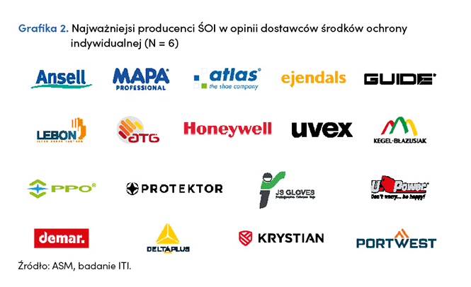 Dostawcy ŚOI podkreślali, że mimo iż polskich producentów jest niewielu, to jednak ci, którzy są obecni na rynku, posiadają silną, ugruntowaną pozycję i są znani wśród odbiorców. W opinii jednego z dostawców ŚOI polscy producenci rękawic dostarczają głównie zwykłe, dzianinowe produkty, natomiast te powlekane, chroniące przed zagrożeniami chemicznymi pochodzą głównie od zagranicznych producentów. Do polskich firm produkujących ŚOI, które wymieniali dostawcy, należą: Strzelce Opolskie (JS Gloves), Prorektor, Demar, PW Krystian.
