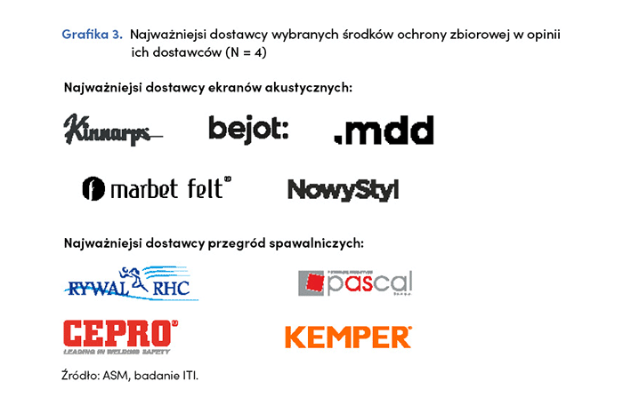 Na polskim rynku ŚOZ w opinii dostawców istnieją głównie dystrybutorzy zagranicznych marek. Widoczne jest to zwłaszcza w przypadku przegród spawalniczych. Natomiast w zakresie przegród akustycznych do pomieszczeń biurowych istnieje kilku polskich producentów np. Bejot. W opinii dostawców rynek ten jest wypełniony dużą ilością konkurencyjnych firm i jest raczej rozdrobniony. Najważniejszych graczy wśród producentów i dystrybutorów ŚOZ, w opinii ich dostawców przedstawia poniższa grafika.