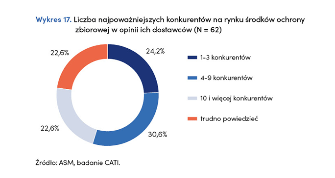 Badani dostawcy wskazali, że na rynku ŚOZ jest sześciu najpoważniejszych konkurentów (średnia). 24,2% respondentów zadeklarowało, że liczba kluczowych konkurentów nie przekracza trzech. Warto podkreślić, że 22,6% badanych dostawców nie potrafiło wskazać liczby kluczowych konkurentów na rynku ŚOZ.