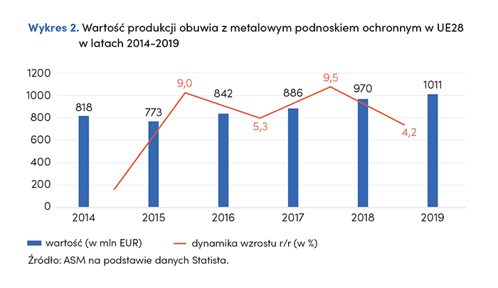 W krajach UE28 zdecydowanie najwięcej produkuje się obuwia ochronnego. Produkcja ta wzrosła z 818,34 mln EUR w 2014 roku do 1 mld EUR w 2019 roku. W ciągu pięciu lat nastąpił więc wzrost o 23,6%. W analizowanym okresie największy wzrost wartości produkcji w stosunku do roku poprzedniego nastąpił w 2018 i 2016 roku.