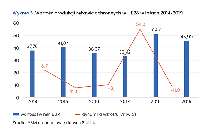 Produkcja rękawic ochronnych na terenie UE28 nie jest tak znacząca jak produkcja ochronnych nakryć głowy. W 2014 roku wartość produkcji rękawic ochronnych w krajach UE28 wyniosła 37,76 mln EUR i mimo wzrostu wartości produkcji w następnym roku, kolejne dwa lata odnotowały spadki wielkości produkcji tego rodzaju ŚOI. Rok 2018 przyniósł 54,3% wzrost produkcji rękawic ochronnych, osiągając wartość 51,57 mln EUR. Jednak już w 2019 roku wartość produkcji spadła do 45,90 mln EUR (spadek o 11% względem 2018 roku).