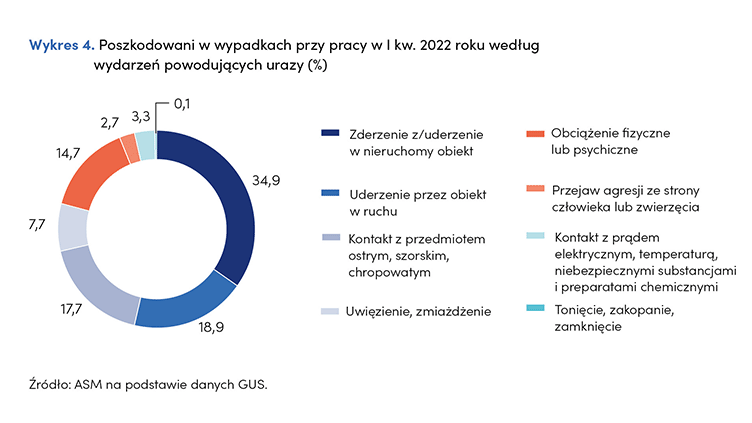 Najwięcej poszkodowanych w wypadkach przy pracy to poszkodowani w wyniku zderzenia z nieruchomym obiektem (34,9%). Uderzenia przez obiekt w ruchu są przyczyną urazów w 18,9% przypadków. W 17,7% wypadków przy pracy są one wynikiem kontaktu z przedmiotem ostrym, szorstkim lub chropowatym.