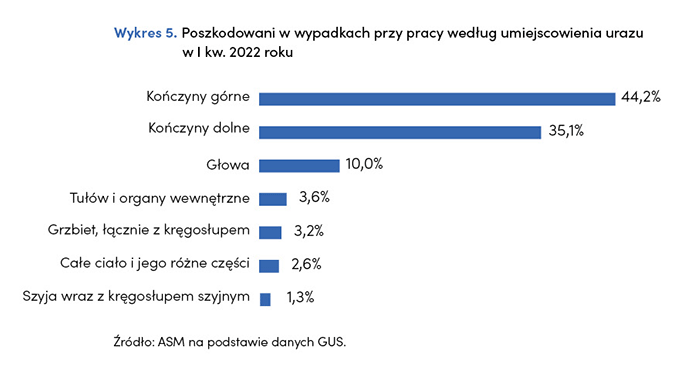 Do wypadków przy pracy najczęściej dochodzi podczas poruszania się przez pracownika(40,3%). Jedynie w 12% do urazów dochodzi podczas prac wykonywanych narzędziami ręcznymi, a w 8,8% podczas obsługi maszyn. Natomiast do najczęstszych urazów należą urazy kończyn górnych (44,2%) oraz kończyn dolnych (35,1%). Z danych tych więc wynika, że w przypadku ŚOI największe zapotrzebowanie pojawi się na środki ochrony rąk i nóg.