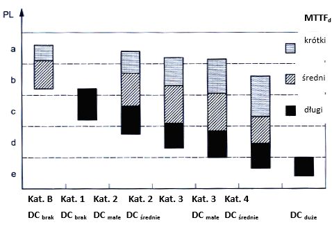 Z przedstawionego wyżej schematu wynika, że wymagany poziom zapewnienia bezpieczeństwa PL można osiągnąć realizując układ sterowania w kilku różnych kategoriach, w zależności od tego jak niezawodne są elementy wykorzystane do jego budowy – o czym świadczy średni czas między niebezpiecznymi uszkodzeniamiMTTFd oraz od tego jakie jest pokrycie diagnostyczne układu DC – świadczące o wykrywalności defektów.