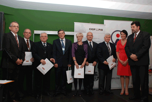 Od lewej: dr hab. inż. Wiktor Marek Zawieska - Z-ca Dyrektora CIOP-PIB ds. Techniki i Wdrożeń, liderzy zespołów tematycznych Forum Liderów (Jan Rogalski – ZT „Energetyka”, Tadeusz Leszczyński – ZT „Usługi”, Witold Rusak – ZT „Przemysł chemiczny”, Elżbieta Bożejewicz – ZT „Budownictwo”, Stefan Kwaśny – ZT „Przemysł ciężki”, Jan Biardzki – ZT „Przemysł lekki”), Agnieszka Szczygielska - CIOP-PIB oraz Mariusz Butowski – Stabilator Sp. z o.o.