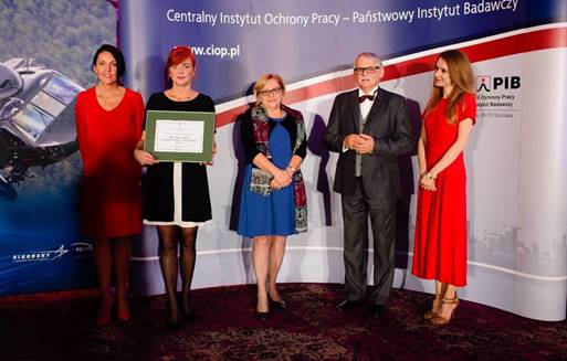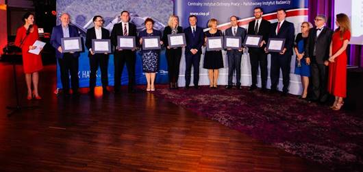 Na zdjęciu od lewej: Mirosław Molik – Komendant 3. Regionalnej Baza Logistycznej w Krakowie, Andrzej Kleszcz (Wiceprezes ds. technicznych) - Centralna Stacja Ratownictwa Górniczego, Marek Ciapała (Dyrektor) - PGE Górnictwo i Energetyka Konwencjonalna S.A. Oddział Elektrownia Bełchatów, Krzysztof Snoch (Specjalista ds. bhp) - PGE Górnictwo i Energetyka Konwencjonalna S.A. Oddział Elektrowni Dolna Odra, Zbigniew Stępień (Kierownik Działu BHP) i Dariusz Loska (Dyrektor BHP) - Polski Koncern Naftowy ORLEN S.A., Mariusz Piątkowski (Kierownik działu bhp) - Mostostal Warszawa S.A., Marcin Kopera (Główny Specjalista ds. BHP) - Iławskie Przedsiębiorstwo Budowlane IPB Sp. z o.o., Piotr Lisiecki (Prezes Zarządu) - Huta Bankowa Sp. z o.o., Barbara Ciesielska (Kierownik BIURA BHPiOŚ) - Grupa Kapitałowa Polimex-Mostostal, Witold Rusak (Dyrektor Departamentu Bezpieczeństwa Technicznego) - Grupa Azoty Zakłady Azotowe Kędzierzyn S.A., Anna Majcher-Stabrowska (Menedżer EHS i Zarządzania Ryzykiem) - GlaxoSmithKline Pharmaceuticals S.A., Lech Żak (Prezes Zarządu) - Enea Elektrownia Połaniec Spółka Akcyjna, Joanna Bugajska – Kierownik Zakładu Ergonomii CIOP-PIB, Wiktor Marek Zawieska – Z-ca Dyrektora ds. Techniki i Wdrożeń CIOP-PIB, Aneta Kleczkowska – Ośrodek Promocji i Wdrażania CIOP-PIB