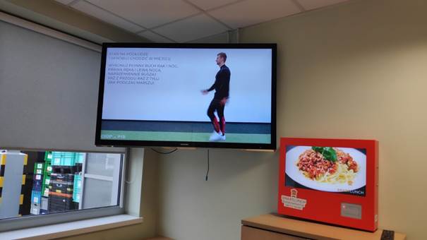 Filmy CIOP-PIB, udostępnione na stronie internetowej kampanii www.ciop.pl/aktywnmiwpracy, dotyczące ćwiczeń dla osób pracujących fizycznie i przy biurku, pracownicy mogą oglądać w kantynie. Linki do tych filmów zostały także rozesłane do wszystkich posiadaczy maila firmowego.