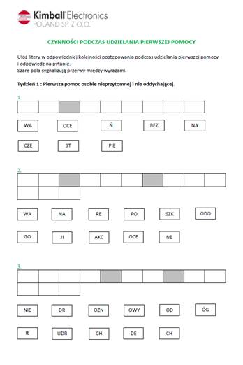4. Ostatnią aktywnością w ramach prowadzonej kampanii był konkurs BHP dla młodych pracowników (wszystkie osoby ze stażem poniżej 2 lat w Kimball). W ramach powyższego konkursu „młodzi” pracownicy przez 6 tygodni rozwiązywali krzyżówki i odpowiadali na pytania związane z pierwszą pomocą przedmedyczną, ochroną przeciwpożarową i BHP. Konkurs spotkał się z całkiem dużym zainteresowaniem pracowników (zaangażowało się kilkadziesiąt osób).