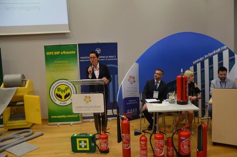 I panel związany z bezpieczeństwem przy pracy rozpoczęła p. Joanna Tokarska - starszy inspektor pracy w Okręgowym Inspektoracie Pracy w Rzeszowie, która przybliżyła zagadnienia związane z oceną ryzyka zawodowego pracowników narażonych na kontakt z czynnikami chemicznymi i obowiązki pracodawcy w tym zakresie. Następnie głos zabrały p. Dorota Żelazko i Joanna Leśniak z Zakładu Ubezpieczeń Społecznych. Podczas swoich prelekcji przedstawicielki ZUS omówiły zagadnienia związane ze świadczeniami ZUS z tytuły wypadków przy pracy i chorób zawodowych oraz prewencją rentową i wypadkową w ZUS. Następnie o obowiązkach pracodawcy przy zatrudnianiu pracownika i przepisach bezpieczeństwa pracy opowiedziała p. Barbara Nizioł z firmy Law& Training Center. Na zakończenie pierwszego panelu głos zabrali p. Marcin Greguła i Paweł Gliszczyński z firmy Orzeł Biały S.A, którzy omówili dobre praktyki bezpieczeństwa przy pracy w kontakcie z substancjami chemicznymi i szczególną uwagą kierowaną na młodych i niedoświadczonych pracowników, którzy bardzo często pracując w narażeniu na szkodliwe działanie czynników chemicznych lekceważą zagrożenie.