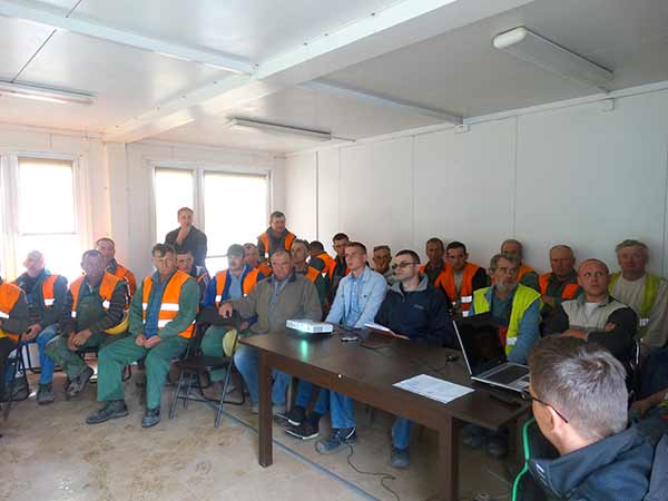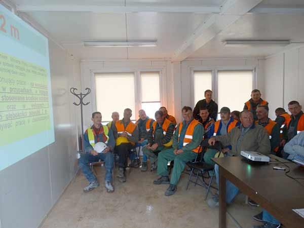 W części teoretycznej szkolenia omówiono regulacje prawne z zakresu bezpieczeństwa pracy podczas pracy na budowie, w tym pracy na wysokości, obsłudze urządzeń stosowanych na budowie, czynników szkodliwych występujących w procesie budowlanym a także zasady udzielania pomocy przedlekarskiej w razie wypadku. Prelegentami byli pracownicy Spółki.