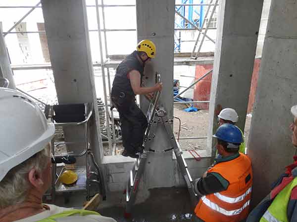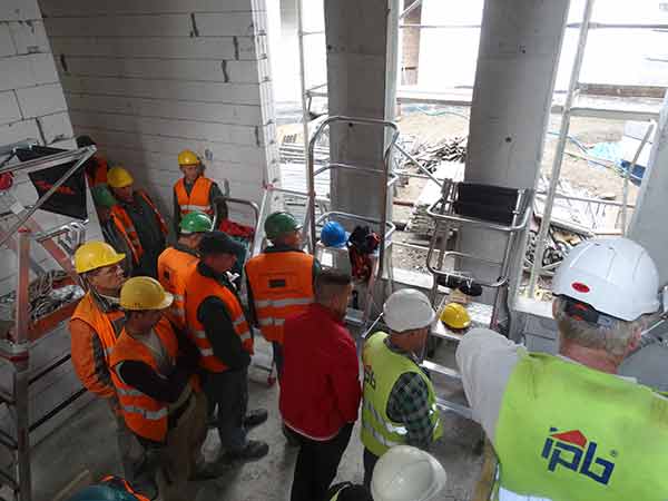 W dniu 23 i 24 czerwca br. na trzech budowach Spółki oraz jej podwykonawców przeprowadzono szkolenie na temat pracy na wysokości oraz możliwości stosowania do takich prac sprzętu pomocniczego. Do realizacji tematu zaproszono inspektora pracy Okręgowego Inspektoratu Pracy w Olsztynie oraz firmę Akala Faraone z Goleniowa, producenta i dystrybutora pomostów roboczych, drabin i rusztowań do pracy na budowie. Po części teoretycznej, prowadzonej przez przedstawiciela firmy Faraone oraz inspektora pracy, pracownicy Spółki oraz pracownicy firm podwykonawczych wykonujący pracę na budowie, mogli zobaczyć produkty oferowane przez firmę. Przedstawiciel firmy Akala Faraone prezentował praktyczne zastosowanie drabin do prac doraźnych, sposoby mocowana drabin przystawnych a także sposób montażu rusztowań przeznaczonych do prac wykończeniowych na budowie.