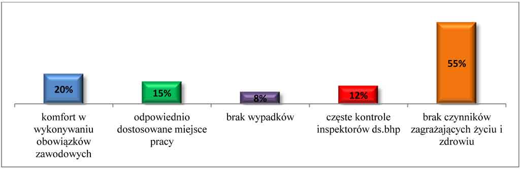 Jak wynika z przeprowadzonego badania pojęcie „bezpieczeństwo pracy" różnie rozumie przez pracowników (wykres 1). Dla większości (55% ankietowanych) oznacza po prostu brak czynników zagrażających życiu i zdrowiu, dla 20% - to komfort w wykonywaniu obowiązków zawodowych, dla 15% - odpowiednie dostosowanie miejsca pracy. Dodatkowo dla 12% ankietowanych bezpieczeństwo pracy oznacza częste kontrole inspektorów ds. bhp, a dla 8% to brak wypadków.