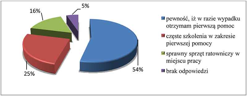 Sprawny system pierwszej pomocy jest istotnym elementem w naszym życiu. Każdy człowiek chce wiedzieć, iż w razie jakichkolwiek nagłych zdarzeń jest ktoś, kto potrafi nam fachowo pomóc. W wyniku ankiety stwierdzono, że 54% osób za sprawny system pierwszej pomocy uznaje pewność, iż w razie wypadku otrzyma pierwszą pomoc, 25% ankietowanych uważała, że są to częste szkolenia w zakresie pierwszej pomocy (wykres 11). Dla 16% jest to sprawny sprzęt ratowniczy w miejscu pracy. 5% pracowników nie udzieliło odpowiedzi na to pytanie.