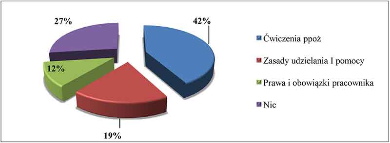 W opinii pracowników szkolenia bhp są ważnym elementem systemu bezpieczeństwa pracy w przedsiębiorstwie. Jednak większość z nich zapamiętuje z tych szkoleń tylko pojedyncze elementy programu, w dodatku głownie elementy praktyczne (wykres 13). W przypadku 42% pracowników zapamiętało przebieg ćwiczeń przeciwpożarowych, ale aż 27% ankietowanych z ostatniego szkolenia BHP nie zapamiętała nic. Pozostałym osobom w pamięci pozostały zasady udzielania pierwszej pomocy (19%) oraz jakie są prawa i obowiązki pracownika (12%).