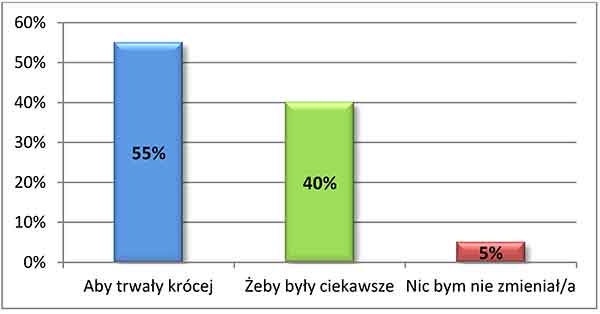 Kolejne pytanie służyło poznaniu opinii pracowników na temat sposobu prowadzenia szkoleń w przedsiębiorstwie. 55% respondentów chciałoby, żeby szkolenia trwały krócej, a zdaniem 40% badanych szkolenia powinny być ciekawsze. Tylko 5% respondentów stwierdziło, że nic by nie zmieniło.