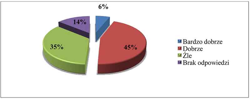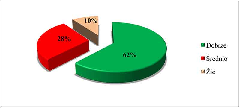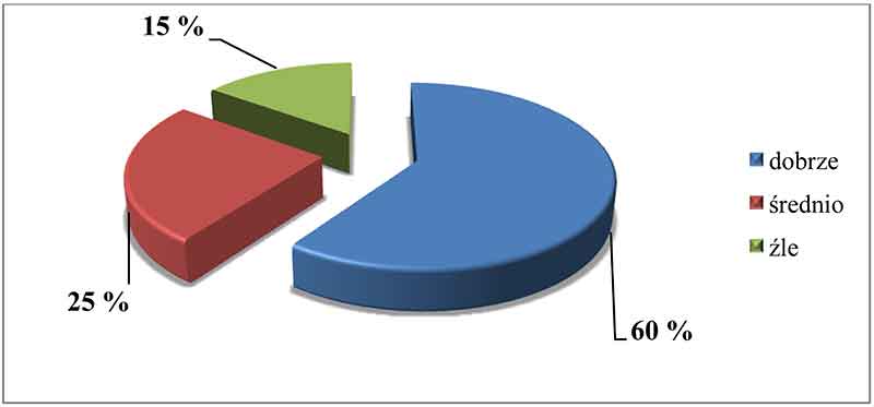 Odpowiedni poziom bezpieczeństwa wpływa na samopoczucie pracowników i dodatkowo zwiększa jakość i efektywność pracy. Drugie pytanie miało więc sprawdzić, jak pracownicy oceniają poziom bezpieczeństwa pracy w przedsiębiorstwie (wykres 2). Większość ankietowanych (60%) uważała, że poziom bezpieczeństwa jest dobry, 25% określa go jako średni, a 15% jako zły. Można stwierdzić, iż stawia to firmę w dobrym świetle.