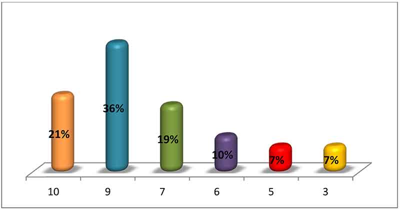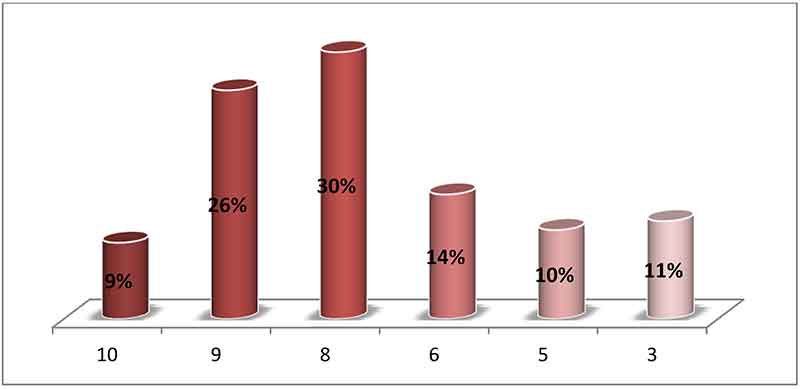 Kolejne pytanie dotyczyło subiektywnego poziomu bezpieczeństwa na zajmowanych stanowiskach pracy1. Z wyników jasno widać, iż poziom ten ustalony jest na dość wysokim poziomie (wykres 3). Zdecydowana większość osób (57%) odpowiedziało, iż poziom oceniają na 9 lub 10. Na kolejnych miejscach w opinii ankietowanych jest poziom 7 i 6. Uznało tak odpowiednio 19% i 10% respondentów. Pozostali ankietowani (14%) uważają, że poziom bezpieczeństwa jest na poziomie 5 i 3.