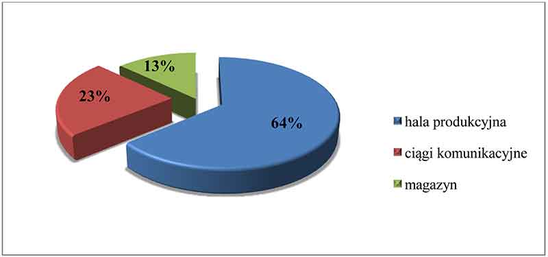 Ankietowani uznali, że miejscem najbardziej narażonym na wypadki są hale produkcyjne (64%), 23% osób wskazało na ciągi komunikacyjne, a 13% magazyn (wykres 5).