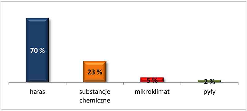 Warunki środowiska, gdzie odbywa się proces pracy są kształtowane przez występujące w środowisku czynniki (fizyczne, chemiczne i biologiczne), których źródłem są procesy technologiczne przetwarzające materiały i surowce. Stopień natężenia czynników szkodliwych decyduje o tym, czy środowisko pracy jest uciążliwe oraz czy stwarza zagrożenie zdrowia, a nawet życia pracowników. Jako główny czynnik szkodliwy zagrażający zdrowiu pracowników został wskazany hałas (70%), a następnie substancje chemiczne (23%). Pozostałe wskazane czynniki to mikroklimat i pyły (wykres 6).