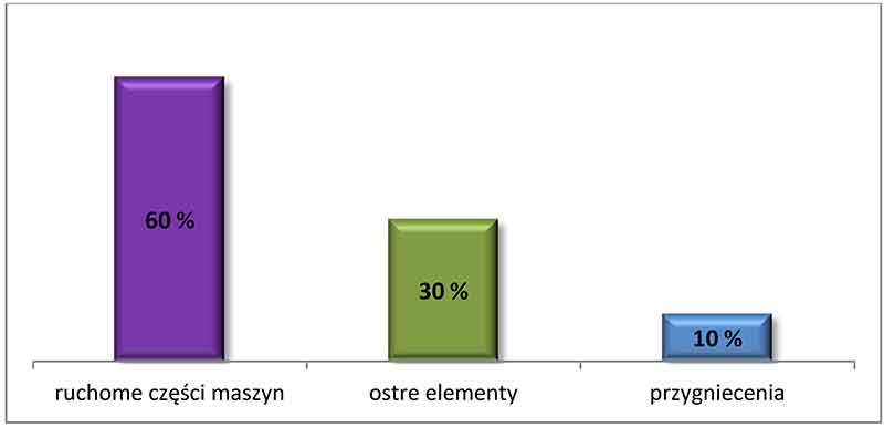 Każda niebezpieczna sytuacja powoduje zagrożenie dla życia lub zdrowia. Aby można było pomóc poszkodowanej osobie należy wiedzieć, jakie są skutki niebezpiecznych zdarzeń. Istotnym elementem jest również to, aby pracownicy byli w stanie rozpoznać niebezpieczne czynniki występujące na ich stanowisku pracy, bądź też w ich firmie. 60% ankietowanych wymienia jako czynnik niebezpieczny ruchome części maszyn, kolejną grupą czynników są ostre elementy (30%), natomiast 10% uważa, że są to przygniecenia (wykres 7).
