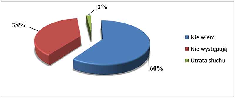 Zmiany zdrowotne spowodowane obecnością czynników szkodliwych w środowisku pracy nazywamy chorobą zawodową, a ryzyko jej powstania zależy od rodzaju czynnika, stopnia i czasu narażenia zawodowego oraz sposobu wykonywania pracy. Niestety większość pracowników nie zdaje sobie sprawy z tego, jakie choroby zawodowe wiążą się z wykonywaną przez nich pracą. Jest to aż 60 % ankietowanych (wykres 8). Ponadto 38% pracowników uważa, że z wykonywaną przez nich pracą nie wiążą się żadne choroby zawodowe, a pozostałe osoby uważały, iż praca na ich stanowiskach pracy może wiązać się z utratą słuchu.