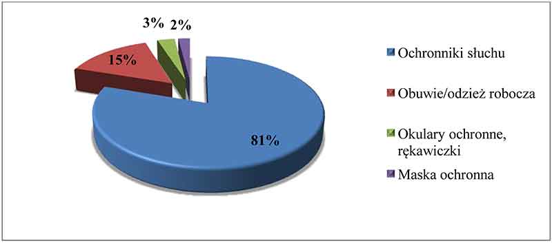 W każdym zakładzie pracy środki ochron indywidualnych powinny być zapewnione każdemu pracownikowi, na którego stanowisku występują zagrożenia związane z wykonywaną pracą. Środki ochrony indywidualnej zapewnia pracodawca. Powinny być używane przez pracowników w miejscach, gdzie nie można wyeliminować zagrożeń. W przypadku analizowanej firmy pracownicy najczęściej stosowali środki ochrony indywidualnej w postaci ochronników słuchu (81%) oraz obuwia i odzieży roboczej (15%) (wykres 9).