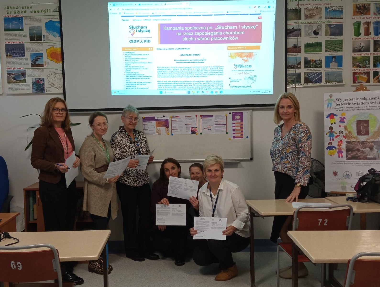 W dniu 4 listopada 2025 r. nauczycielki Anna Pawlaczuk i Mieczysława Jankowska przeprowadziły szkolenie warsztatowe dla nauczycieli w ramach programu Wewnątrzszkolnego Doskonalenia Nauczycieli (WDN), w którym wzięło udział 15 osób. Podczas szkolenia omówiono podstawy funkcjonowania narządu słuchu, najczęstsze zagrożenia środowiskowe, metody edukacji dotyczącej ochrony słuchu, sposoby reagowania na niepokojące objawy, mogące świadczyć o zaburzeniach słuchu, a także zagadnienie, jak współpracować z uczniem z CAPD (centralnym zaburzeniem przetwarzania słuchowego). Nauczyciele otrzymali materiały dydaktyczne oraz zestaw dobrych praktyk do wykorzystani podczas zajęć lekcyjnych.