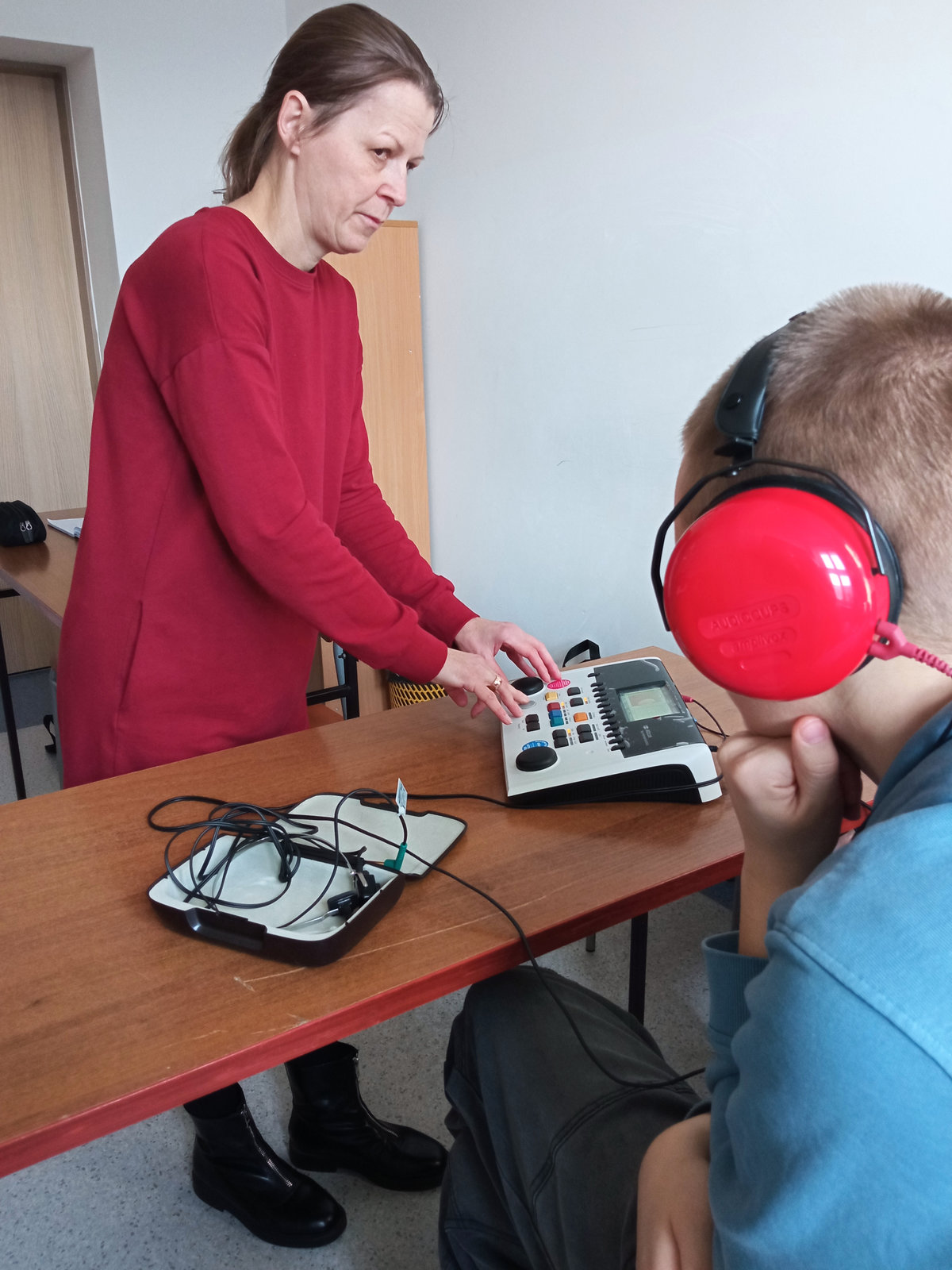 Również w listopadzie dla chętnych uczniów i nauczycieli pani Anna Pawlaczuk – surlogopeda i protetyk słuchu, przeprowadziła badanie słuchu – audiometrię tonalną. Badanie pozwoliło stwierdzić, jak dobrze badana osoba słyszy; umożliwiło również wczesne wykrycie ewentualnych nieprawidłowości oraz zaplanowanie dalszej diagnostyki lub terapii. Każdy uczestnik otrzymał informację zwrotną dotyczącą wyników badania oraz wskazówki, jak dbać o słuch.
