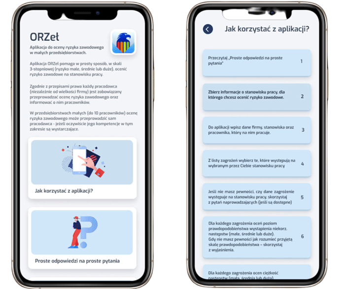 Aplikacja ORZeł pomaga w prosty sposób, w skali 3-stopniowej (ryzyko małe, średnie lub duże), ocenić ryzyko zawodowe na stanowisku pracy.