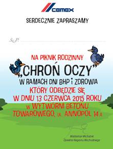 Kierujący Wytwórniami Betonu Towarowego w Warszawie, pod przewodnictwem Dyrektora, Pana Waldemara Michalskiego, zorganizowali Dzień BHP dla pracowników, podwykonawców, kontrahentów i ich rodzin pod hasłem „Chroń oczy”. W przedsięwzięciu, które zorganizowano w dniu 13 czerwca 2015 r. wzięło udział ponad 160 osób.