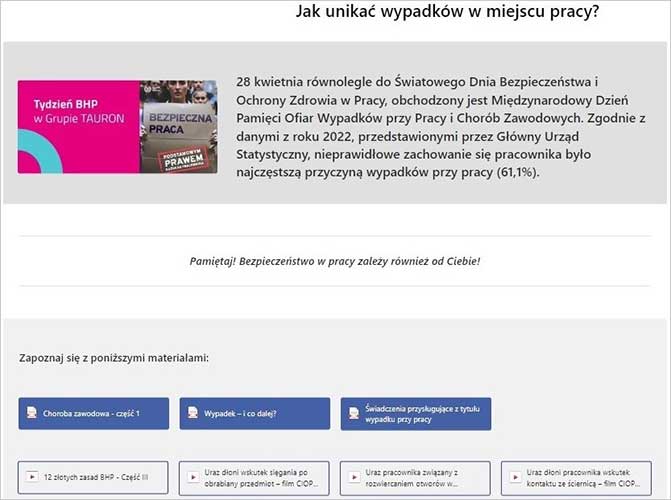 - Grupa TAURON we współpracy z Centralnym Instytutem Pracy – Państwowym Instytutem Badawczym, czynnie włączyła się w obchody Światowego Dnia BHP. W tym celu w spółkach Grupy w dniach 24-28 kwietnia 2023 r. zorganizowano Tydzień z Bezpieczeństwem i Ochroną Zdrowia w Pracy. Podczas kilku dni podjęto szereg działań edukacyjno-szkoleniowych poprawiających świadomość pracowników w zakresie bhp. Pracownicy mogli w tym czasie poznać m.in. najważniejsze prawa, obowiązki i przepisy związane z bezpieczeństwem pracy, a także wziąć udział w konkursie. Dla pracowników grupy przygotowano i opublikowano wiele materiałów edukacyjnych oraz filmy „12 Złotych Zasad BHP Grupy TAURON”. Po uzgodnieniu z CIOP-PIB udostępniono również wybrane filmy CIOP-PIB promujące bezpieczne wykonywanie pracy. Ponadto, część pracowników Grupy TAURON z Wrocławia 28 kwietnia 2023 r. wzięło udział w konferencji online CIOP-PIB pt. „Jak pracować bezpiecznie – niezbędnik młodego pracownika”. Dla dzieci pracowników Grupy TAURON zorganizowano konkurs ”Moi rodzice dbają o swoje bezpieczeństwo w pracy”. Patronat nad obchodami Światowego Dnia BHP w Grupie TAURON objął Prezes Zarządu TAURON Polska Energia S.A., Paweł Szczeszek, któremu przyświeca idea „Bezwypadkowość w Grupie TAURON to nasz wspólny cel”.